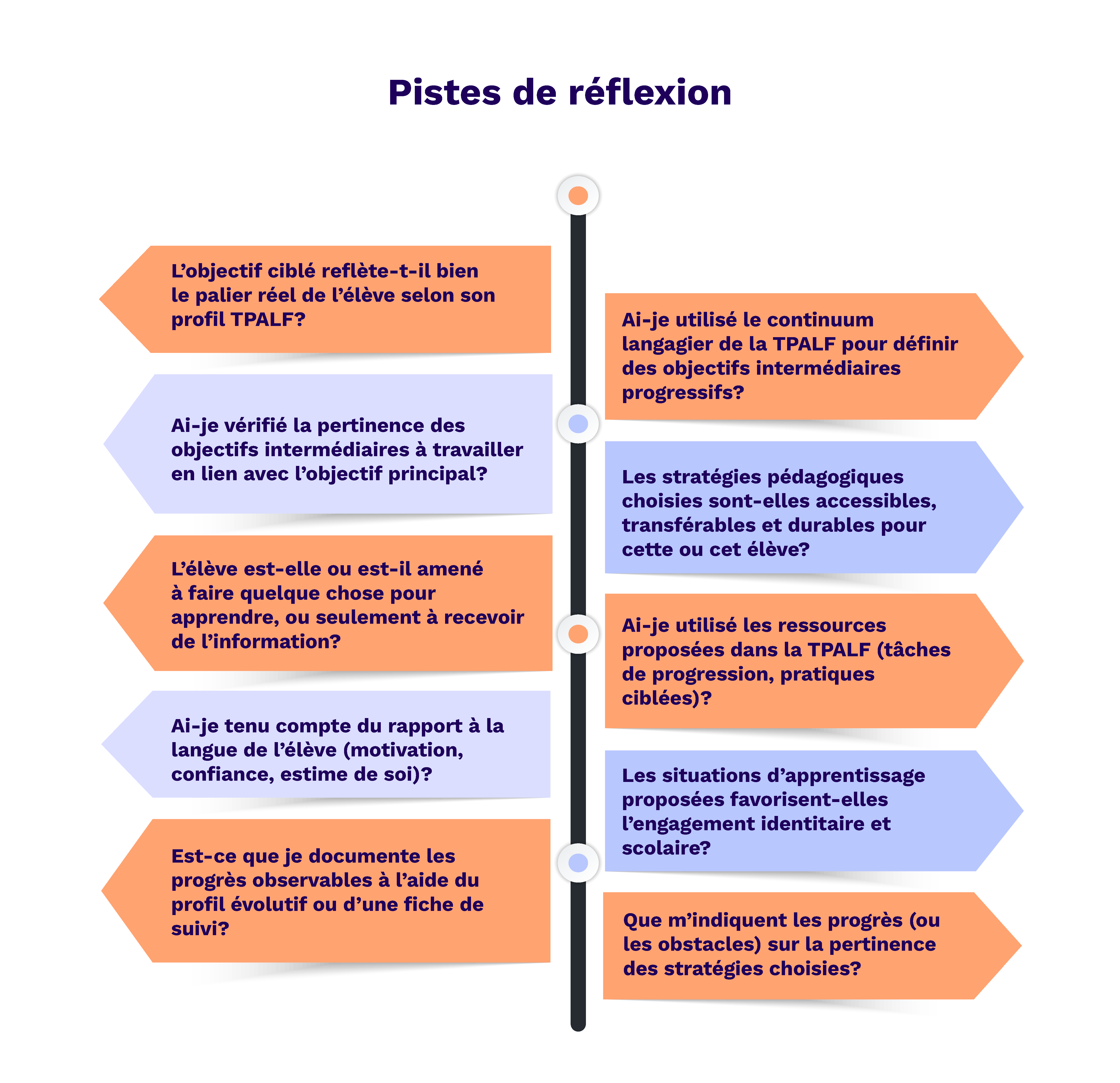 Dans la section Élaboration d’un plan d’appui temporaire, la TPALF a été utilisée pour dresser le profil langagier de l’élève. Dans la présente section, elle devient un levier de planification pédagogique différenciée, servant à structurer les prochaines étapes d’enseignement à partir des objectifs du plan d’appui temporaire.