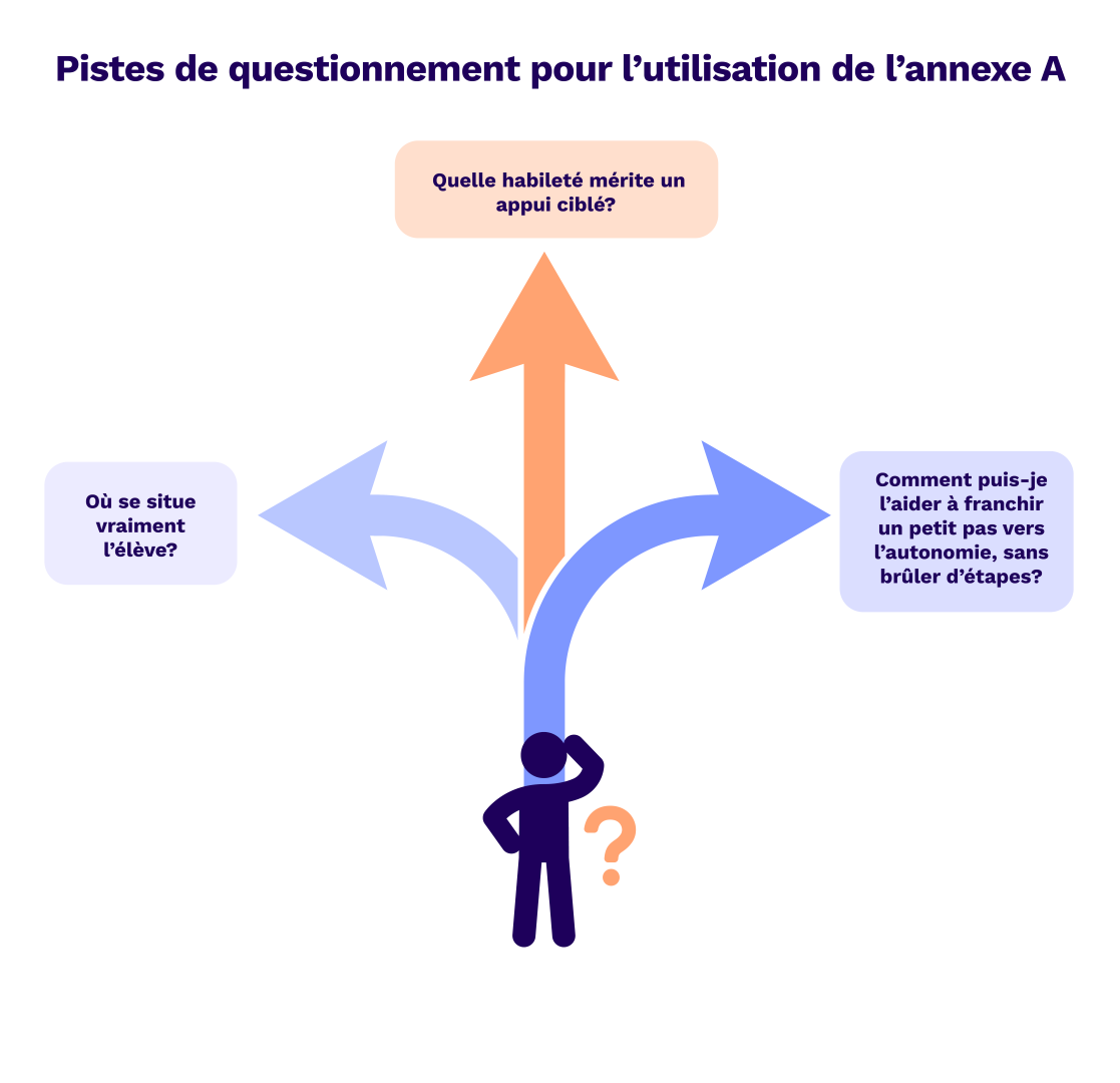 Ainsi, à partir du palier 1 ou 2 en lecture ou en écriture, l’annexe A devient un outil incontournable pour planifier un enseignement ciblé des habiletés de base. L’annexe B, quant à elle, prend tout son sens dès que l’élève démontre une maîtrise relative des fondements et amorce le développement de compétences discursives plus complexes.