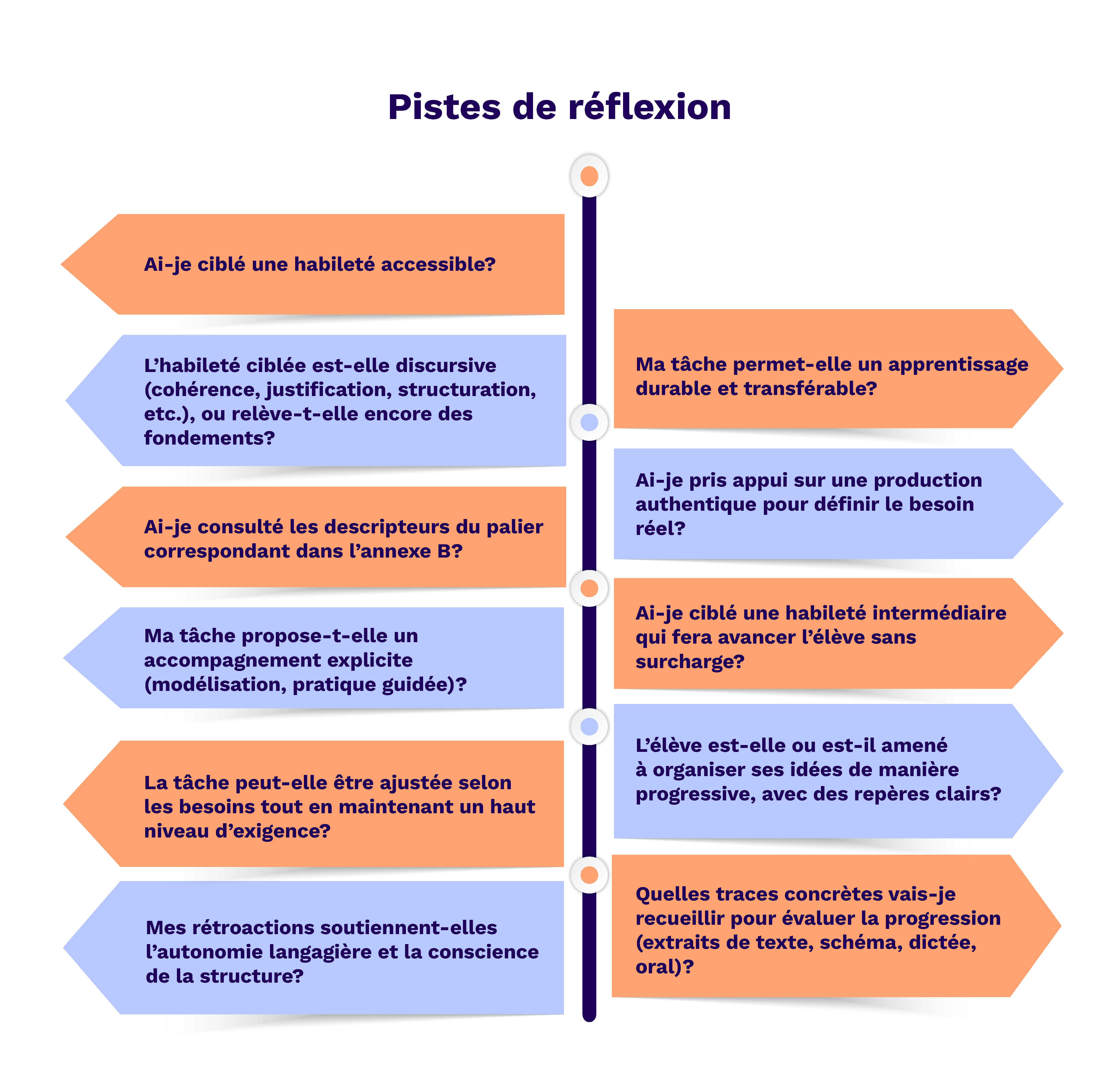 | 3. Cibler la prochaine étape | Cibler un objectif d’apprentissage intermédiaire accessible et utile. | Quelle habileté travailler sans alourdir la tâche? |