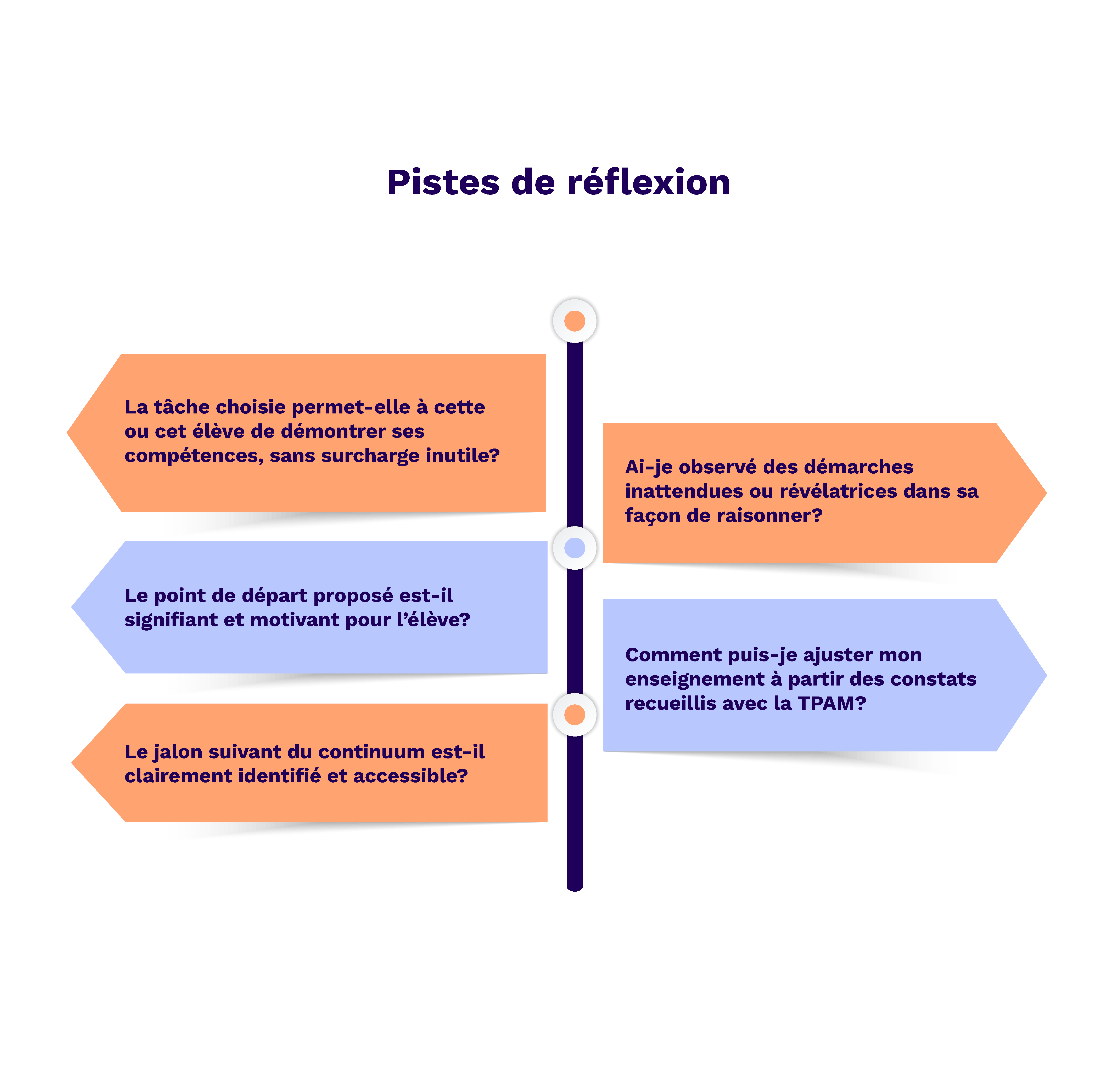 La complémentarité entre la TPAM et le continuum du programme-cadre de mathématiques permet de bâtir une planification à la fois précise, différenciée et cohérente. La TPAM offre un regard authentique sur la manière dont l’élève aborde les concepts, tandis que le continuum trace les étapes vers lesquelles guider sa progression. En combinant ces outils, le personnel enseignant :