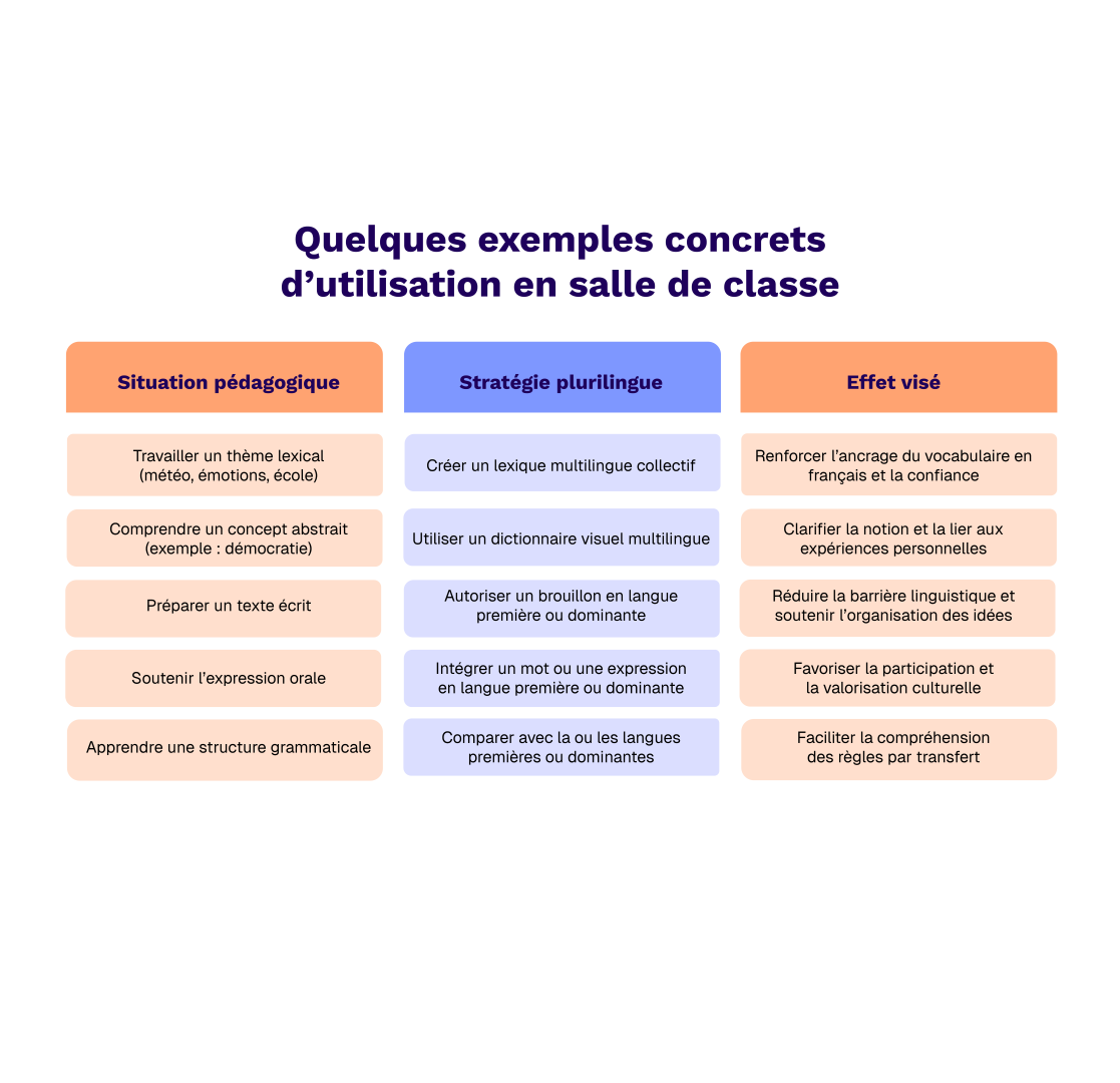 Les approches plurilingues permettent aux ÉP apprenants du français, aux ÉNA et aux ÉNA-ÉP en apprentissage du français de mobiliser l’ensemble de leur répertoire linguistique pour apprendre, comprendre et communiquer. Elles transforment les langues parlées et comprises en leviers d’apprentissage, valorisent les identités linguistiques et culturelles, et renforcent le sentiment de compétence dès les premières interactions scolaires. En salle de classe, elles deviennent un outil structurant au service d’une planification différenciée, inclusive et ancrée dans les réalités linguistiques des ÉP apprenants du français, des ÉNA et des ÉNA-ÉP en apprentissage du français.