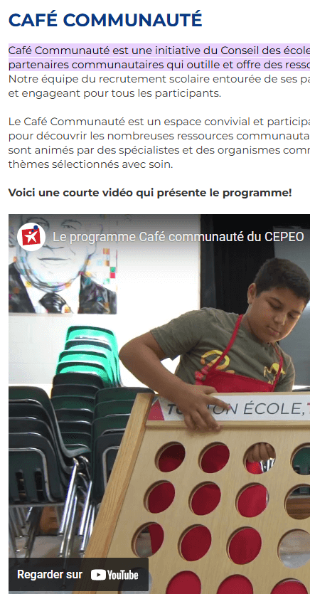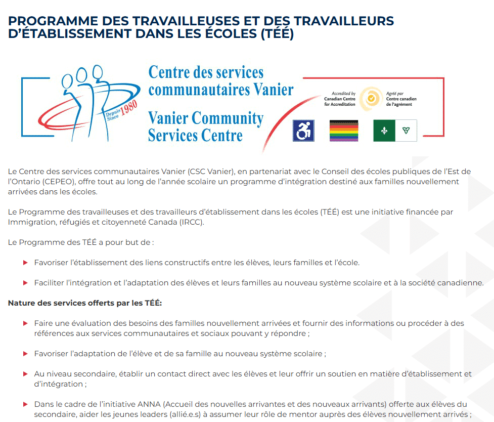 Consultez la page Web Programme des travailleuses et des travailleurs d’établissement dans les écoles (TÉÉ), élaborée par le Conseil des écoles publiques de l’Est de l’Ontario, qui constitue un exemple de contribution et de collaboration des TÉÉ.