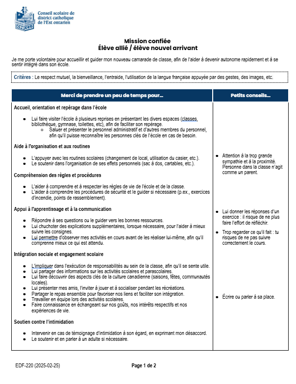 Consultez cette liste de vérification, élaborée par le Conseil scolaire de district catholique de l’Est ontarien, qui constitue un exemple de liste de vérification pour les différentes étapes allant de l’inscription à l’accompagnement d’un élève nouvel arrivant et de sa famille.