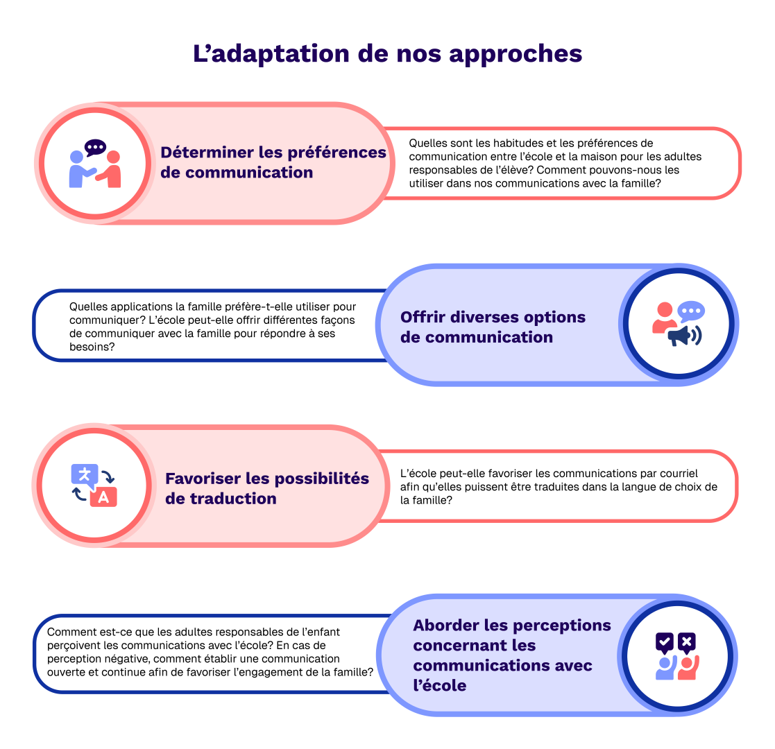 Comment établir une communication adaptée, sensible et efficace avec les familles des ÉP apprenants du français, des ÉNA et des ÉNA-ÉP en apprentissage du français? Dans le protocole d’accueil, réfléchir à ce qu’il faut communiquer, au moment où le faire, à la façon de le communiquer et à la quantité d’informations à transmettre à la fois est une pratique gagnante pour un accueil bienveillant et structuré.